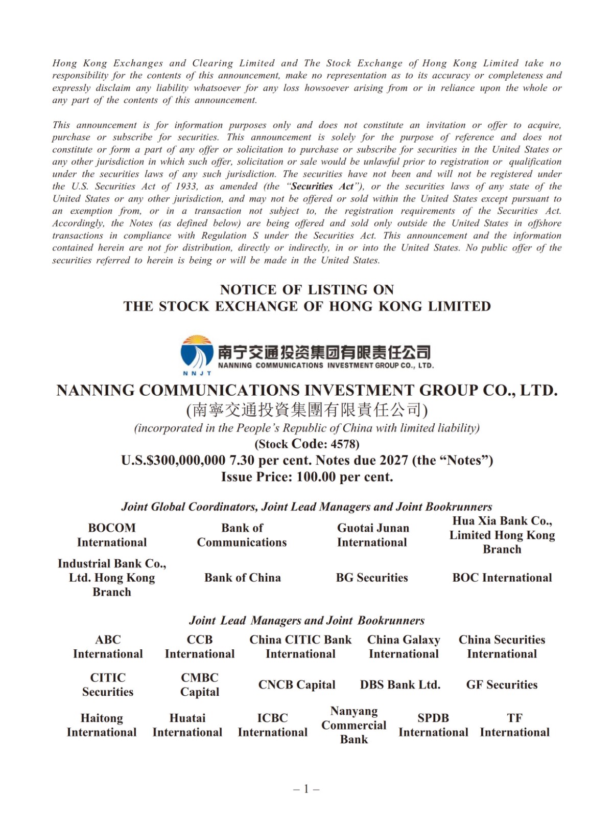 Nanning Communications Investment Group Co., Ltd.(英皇娱乐(中国)官方网站 ) - U.S.$300,000,000 7.30 per cent. Notes due 2027