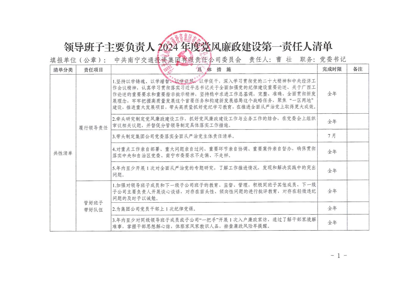 领导班子主要责任人2024年度党风廉政建设第一责任人清单