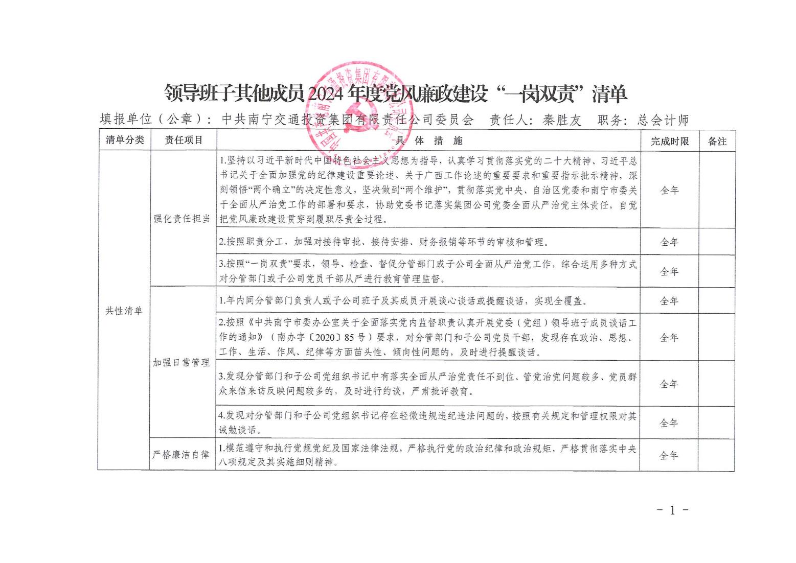 领导班子其他成员2024年度党风廉政建设“一岗双责”清单(七)