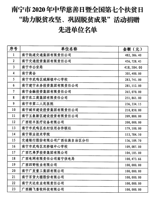 近日,南宁市脱贫攻坚指挥部发布《关于表扬南宁市2020年中华慈善日暨全国第七个扶贫日“助力脱贫攻坚、巩固脱贫成果”活动捐赠先进县(区)、单位的通报》。英皇娱乐 以456728.45元的捐款总金额在各捐赠单位中排名第二,荣获“助力脱贫攻坚,巩固脱贫成果”活动捐赠先进单位称号。