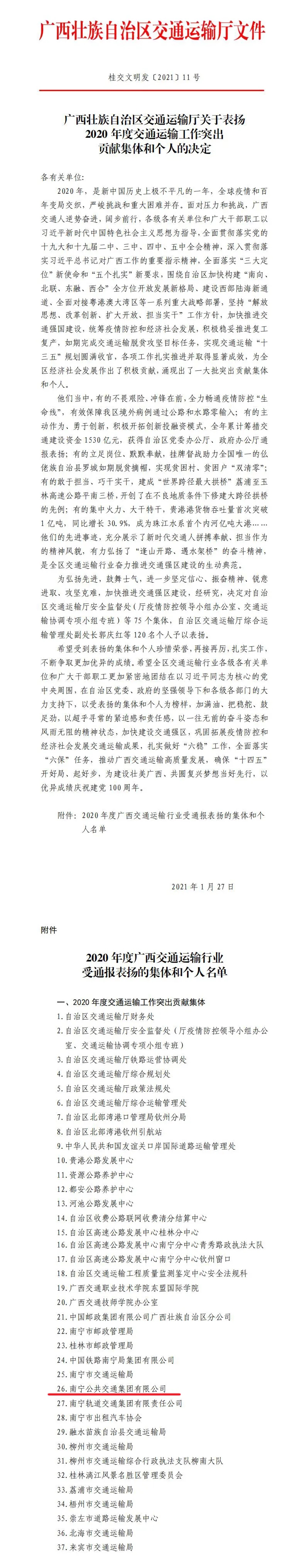 近日,英皇娱乐 下属公交集团获“2020年度广西交通运输工作突出贡献集体”!