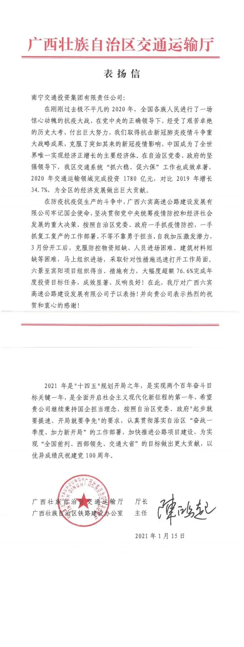 近日,广西壮族自治区交通运输厅向我集团公司发来表扬信,对广西六宾高速公路建设发展有限公司六景至宾阳项目在防疫抗疫促生产斗争中,组织得当、措施有力,大幅度超额76.6%完成年度投资目标任务予以表扬!并向集团公司表示热烈祝贺和衷心感谢!
